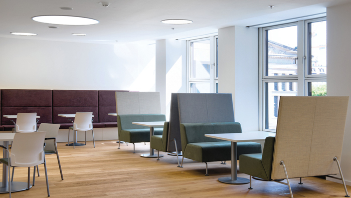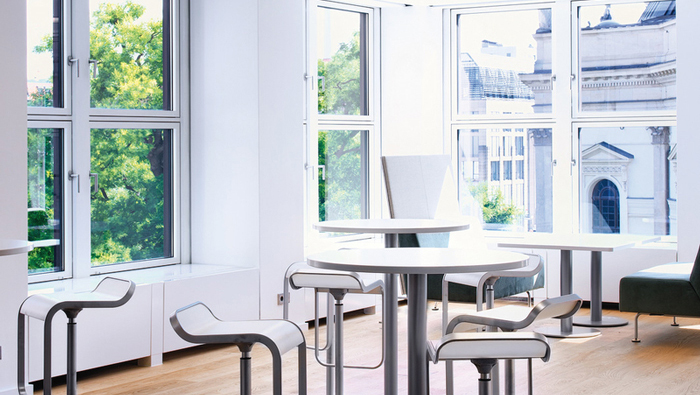 休息區(qū)域的設(shè)計(jì):在這里員工可以坐在這里,什么都不用想,看看窗外的美景,或陶醉、或發(fā)呆、或默默無語、或與人交談,這也是設(shè)計(jì)師希望看到的,在這里生活的壓力都被陽光所驅(qū)散,在這里一切都是如何的透明,讓員工在這里可以休養(yǎng)生息。