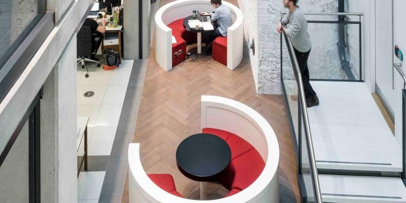 靈活的座椅位于每一層,定制粉紅皮箱設計,包在預制混凝土和胡桃木桌子旁邊的數(shù)據(jù)和電源連接點,為員工提供了“突破”的空間,但仍在辦公室內(nèi)協(xié)同工作。