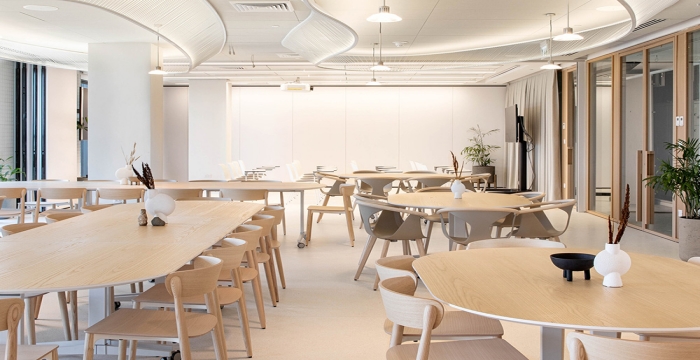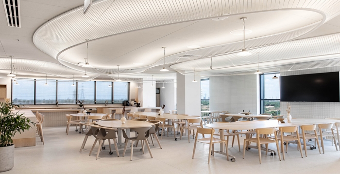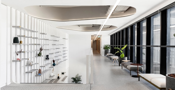 設(shè)計(jì)師將材質(zhì)、定制元素、形式和圖案組合賦予空間靈魂。最直觀的表達(dá)體現(xiàn)于室內(nèi)天花的構(gòu)造上,有機(jī)形式的開放式天花設(shè)計(jì),局部裸露出頂面的管道機(jī)械系統(tǒng)。另一個(gè)就是位于餐廳的獨(dú)特頂面裝置,其形式來(lái)自于對(duì)四個(gè)心腔輪廓的模擬。這組三維裝置強(qiáng)化了客戶的行業(yè)屬性和奮斗的目標(biāo),為空間帶來(lái)與眾不同的體驗(yàn)。