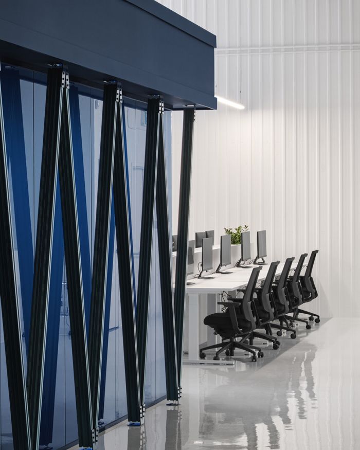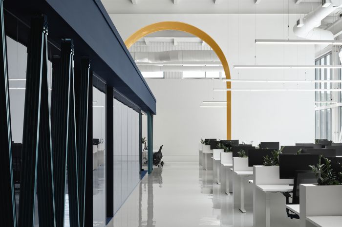 受到都市風格的啟發(fā),工作和會議室類似于城市里的公共和娛樂空間。主體塊的一側(cè)設(shè)置了一道紀念性的拱門,另一側(cè)是一座適應(yīng)性的地臺,可以用作前廳。連接兩層的結(jié)構(gòu)將空間激活成為了一個間隙場所。