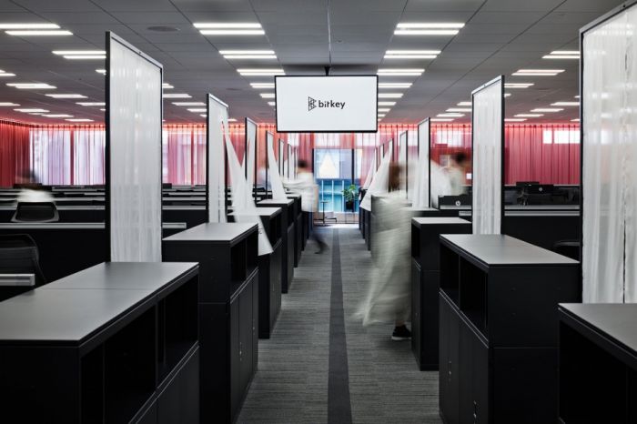 辦公室的設(shè)計(jì)意圖是利用空間各處促進(jìn)人們對(duì)Bitkey業(yè)務(wù)的認(rèn)識(shí)。沿著通道懸掛的大型帷幔體現(xiàn)了Bitkey產(chǎn)品的意圖和顏色,不僅提升了品牌形象,而且通過(guò)區(qū)域之間的舒適過(guò)渡實(shí)現(xiàn)了空間的多樣化使用。獨(dú)特的交流休息室在整個(gè)設(shè)計(jì)中融入了公司文化,成為分享Bitkey核心信息的場(chǎng)所。辦公室的內(nèi)部技術(shù)工作中心消除了團(tuán)隊(duì)之間的隔閡并促進(jìn)員工之間的協(xié)作辦公。