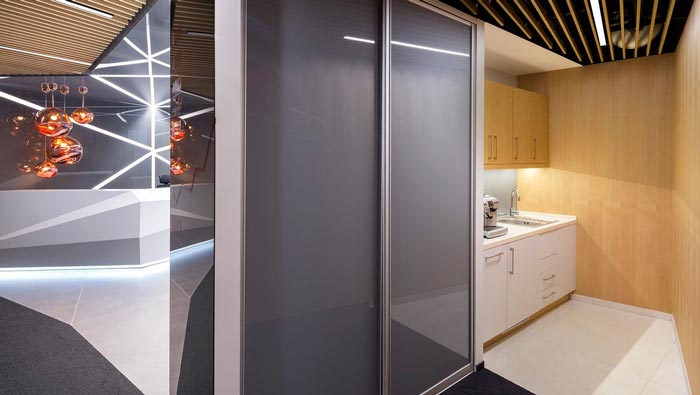獨立茶水區(qū)的設(shè)計:此處位置的設(shè)計十分巧妙,設(shè)計師將其安置在接待區(qū)域與辦公區(qū)域之間,這樣做的好處就是一方面可以供接待客戶之用,另一方面可以方便內(nèi)部員工使用,這樣設(shè)計的好處就是無形中加快辦公的效率,同時將此處空間合理的加以利用,以此增加空間的多元化,設(shè)計師的目的就是讓辦公更加方便。