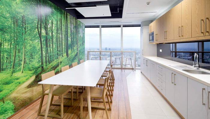茶水間的設(shè)計:此處位于一個獨立的空間之中,與休息空間相互結(jié)合在一起,設(shè)計師這樣做的目的,就是希望給員工打造一個減壓的空間,在這里員工可以遠(yuǎn)離辦公帶來的壓力,帶來暫時的緩解,在這里員工可以相互交流、相互攀談,在這里看看風(fēng)景也不失為一個好的主意,設(shè)計師要做的就是讓員工在這里可以忘卻煩惱。