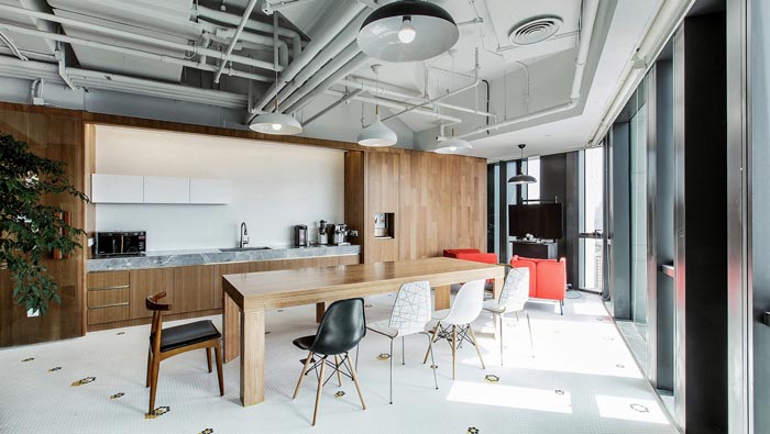 茶水間的設(shè)計:設(shè)計師在設(shè)計的時候,將其安置在空間的一個角落區(qū)域,此處呈三角形分布,設(shè)計師在設(shè)計中將茶水柜安置在空間三角的一條直線上靠墻分布,這樣的好處就是可以為空間留下足夠的使用空間,其中分布有休息桌椅、電視柜、沙發(fā)等,這樣可以讓員工在此地得以放松與歸零。