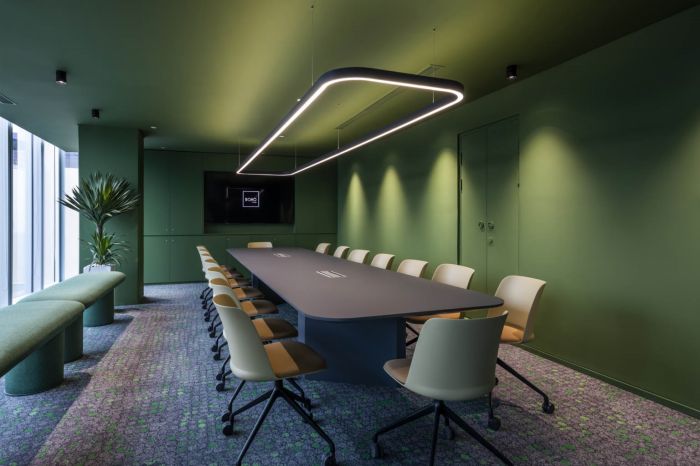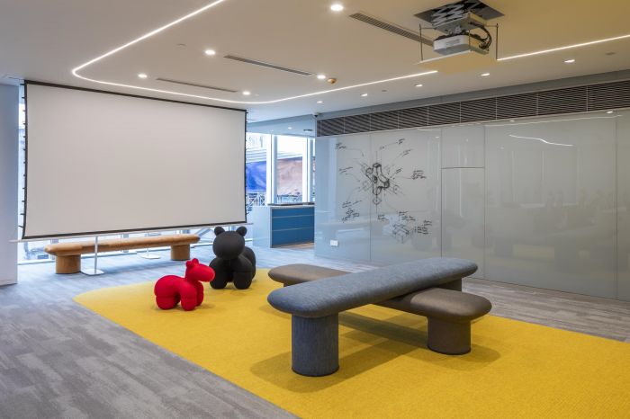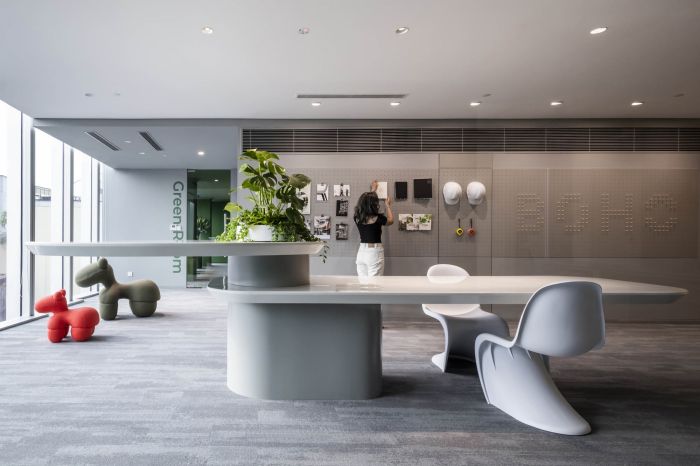 他們試圖打造一個能展現企業(yè)文化并能激發(fā)團隊熱情的辦公場所。所以空間減少了實體隔墻,以展現開放的辦公文化。運用塊面色彩、幾何形式、通透的玻璃隔墻去界定各功能區(qū)域,形成沒有視覺阻隔的開敞空間感。這樣的設計也正好契合公司致力于互動與協(xié)作的工作精神。