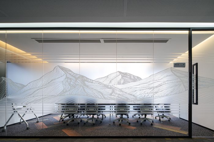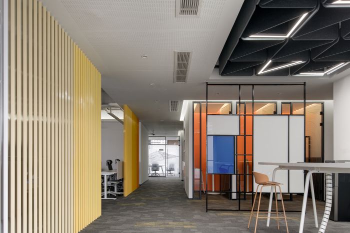 前臺空間使用了白色大理石材質(zhì),整體風(fēng)格簡潔優(yōu)雅。空間右側(cè)使用企業(yè)的品牌色黃色和橙色設(shè)置了一個線條隔斷,用于分隔入口區(qū)域和辦公區(qū),保護(hù)企業(yè)辦公空間的隱私??臻g讓來訪者感覺流暢現(xiàn)代,同時也充滿了企業(yè)的個性。