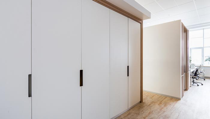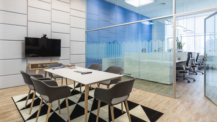 會(huì)議室推拉門的設(shè)計(jì):此處是會(huì)議室的一處活動(dòng)墻,設(shè)計(jì)師這樣設(shè)計(jì)的目的,就是希望空間可以相互連接在一起,當(dāng)會(huì)議開展之時(shí),推拉門將空間形成一個(gè)獨(dú)立的空間,在平時(shí)不用的時(shí)候,可以將其打開,讓空間的效果可以發(fā)揮到最大化。