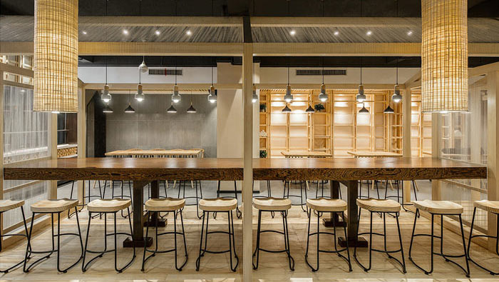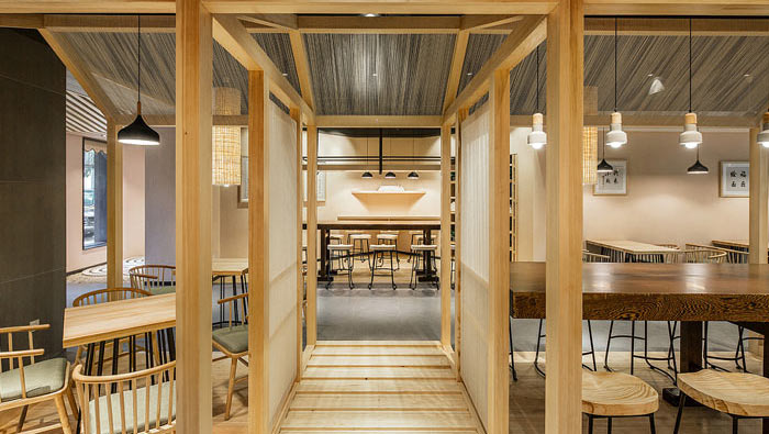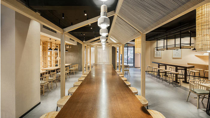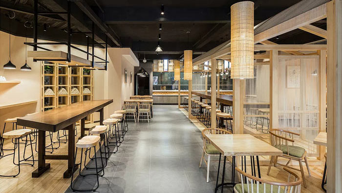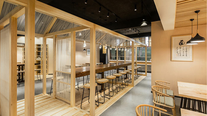 特色面館設(shè)計(jì):整個(gè)空間由原木裝飾構(gòu)造而成,原木材質(zhì)粗糙且質(zhì)樸,細(xì)膩且精致,整個(gè)空間自成一脈,表現(xiàn)了面館精益求精的匠人精神。