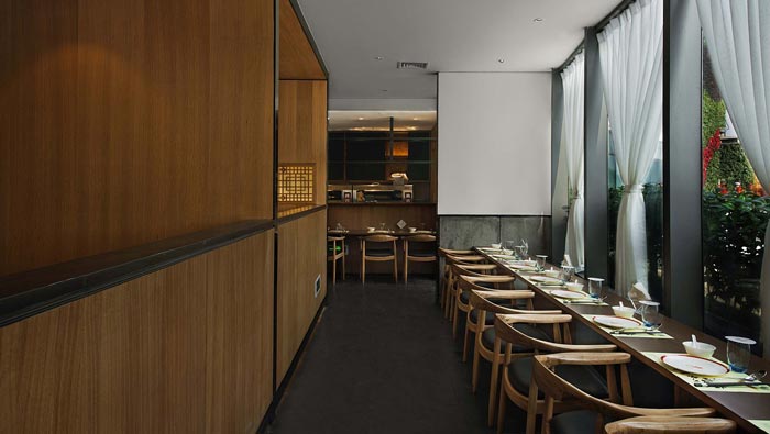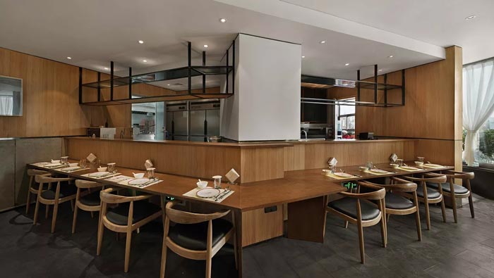特色川菜館廚房餐區(qū)設(shè)計:設(shè)計師在廚房外圍的周邊,打造了一處直角餐區(qū),客戶可以邊就餐,邊看到廚房的情況,讓客戶吃的放心、吃的安心,同時也為餐館營造了10個餐位。