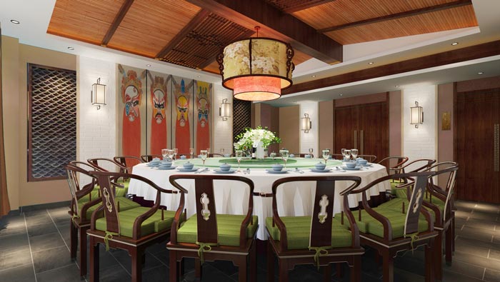 川菜館三樓包廂裝修設(shè)計(jì):這里可以坐下16個(gè)人,這里適合公司之間、一大家子之間的聚餐,這里的氛圍是餐館的競(jìng)爭(zhēng)優(yōu)勢(shì)所在,設(shè)計(jì)師希望這里菜肴絕佳、氛圍絕佳、服務(wù)絕佳。