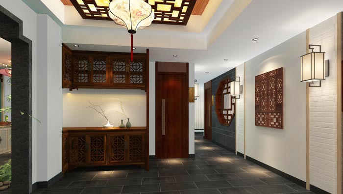 川菜館二樓玄關(guān)裝修設(shè)計(jì):客戶經(jīng)過(guò)樓梯進(jìn)入玄關(guān),經(jīng)過(guò)玄關(guān)進(jìn)入客房,一環(huán)套一環(huán),古色古風(fēng)的設(shè)計(jì)在空間中延續(xù),目的就是空間有一種,自始至終的感覺(jué),給客戶以安心。