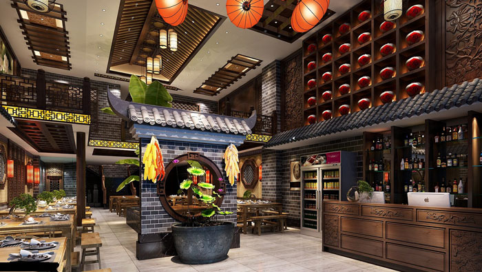 中式川菜館門頭裝修設(shè)計:“庭院內(nèi)花香鳥語,樓臺外月滿天開”展現(xiàn)在客戶面前的是,一幅有韻味、有意境的對聯(lián),門頭的設(shè)計類似家門,讓客戶到這里好像回到了家里面一樣。
