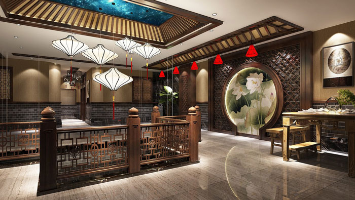 中式川菜館大廳裝修設(shè)計:大廳給人的感覺好似回到過去,但是又稍有不同,設(shè)計師在中式設(shè)計的同時,也加入了很多現(xiàn)代元素,目的就是希望營造一個古代、現(xiàn)代融合的空間。