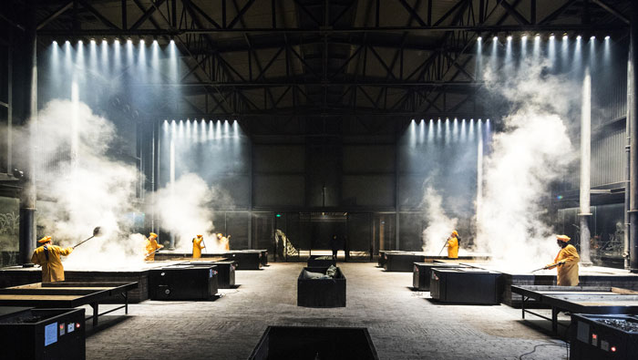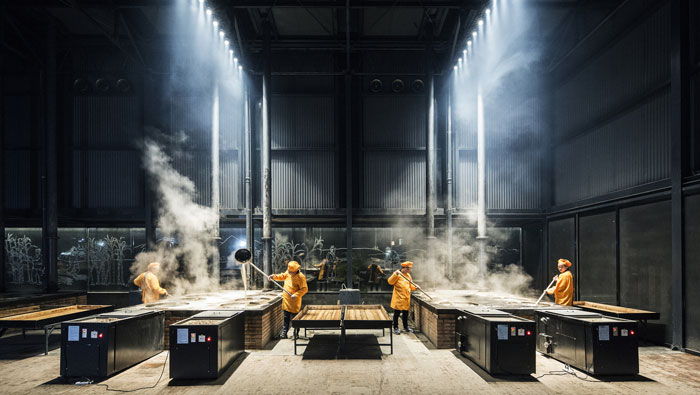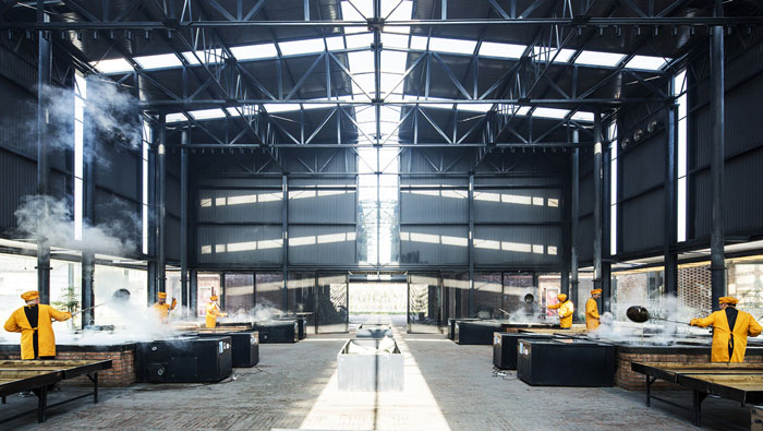 紅糖廠房車間細(xì)節(jié)裝修設(shè)計(jì):這里強(qiáng)調(diào)的是對(duì)煙霧的處理,看似垂直向上的煙霧,實(shí)則也是設(shè)計(jì)師經(jīng)過多次研究的結(jié)果,設(shè)計(jì)師考慮到煙霧對(duì)工作人員的影響,故此重點(diǎn)解決。