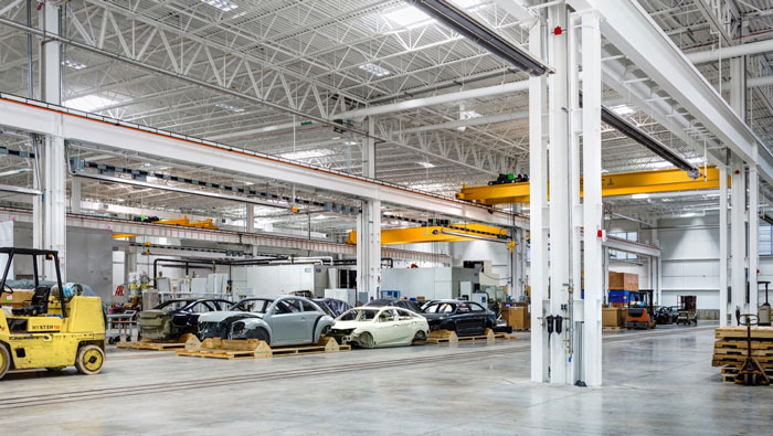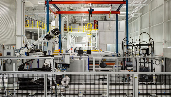 汽車工廠車間裝修設(shè)計(jì):這里是機(jī)器人給汽車原型,進(jìn)行上裝的地方,機(jī)器人搭配先進(jìn)的涂料系統(tǒng),將各種涂料按照原本的計(jì)劃,一步不差的涂抹在車身,車輛上裝在這里完成。