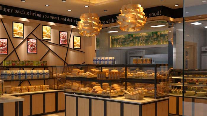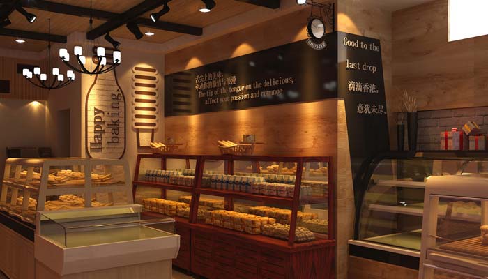 蛋糕店暖色燈光把產(chǎn)品襯托的更加新鮮,右手邊從托盤柜到面包展示平臺再到中島柜、蛋糕模型柜產(chǎn)品集中便于顧客挑選,款臺、水吧緊鄰賣場使結(jié)算購買飲品更加方便。