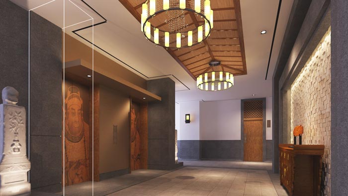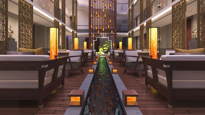 大廳的設(shè)計(jì):顧客進(jìn)入大廳之后,給人的第一感覺就是小溪流入百姓家的感覺,酒店的整體格局是回字形建筑,故此設(shè)計(jì)師在設(shè)計(jì)中,就充分發(fā)揮建筑本身的優(yōu)勢(shì),頂部銀河般的燈帶仿佛彩云一般,上頂彩云、下有小溪,給人營(yíng)造一個(gè)生態(tài)化的自然氛圍。