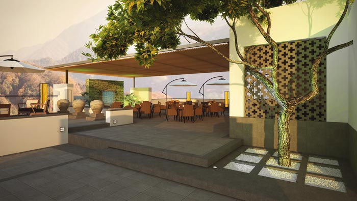 天臺(tái)的設(shè)計(jì):此處位于酒店的樓頂,此處也是設(shè)計(jì)師實(shí)地考察之后得出的靈感,設(shè)計(jì)師在站在樓頂?shù)臅r(shí)候,看到的是一看眾山小的豪情,故此設(shè)計(jì)師靈光一閃將此處設(shè)計(jì)成交流、休息、觀賞區(qū),讓顧客可以在這里欣賞到不一樣的景色,體悟不一樣的美。