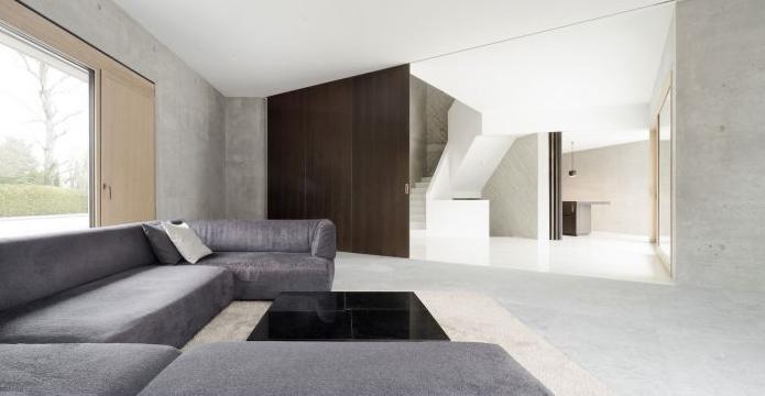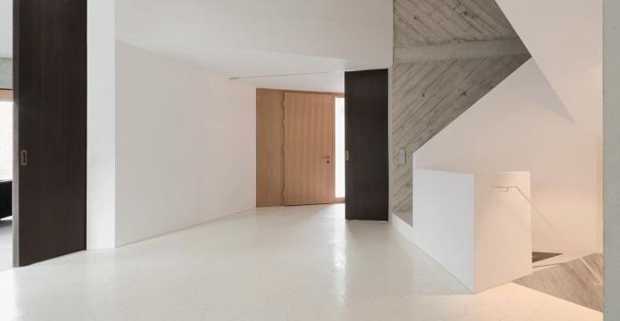 形式的統(tǒng)一體現(xiàn)在材料的統(tǒng)一上。厚厚的超輕質(zhì)混凝土自絕緣墻表面光滑并帶有紋理,而屋頂?shù)牡酌鎰t用粗糙的木板制成,強(qiáng)調(diào)了各個表面的方向。入口區(qū)域的地面上鋪了對角圖案的奶白色多邊形瓷磚。這些柔和的表面調(diào)和了奶白色石膏、灰色石頭和地毯的中性色調(diào),以及橡木和煙熏橡木飾物的自然色調(diào)。