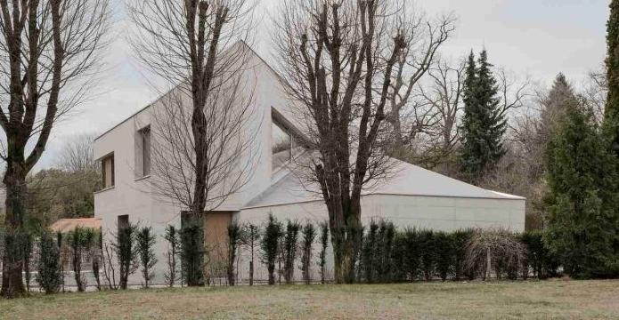 水晶體的形狀從周圍的建筑物中得到的靈感,20世紀(jì)30年代的四坡屋頂矗立在大花園的一角的緊湊單體房屋。在這里,六邊形體塊是傾斜的,為在西北的車庫留出空間,并為南面留出一個寬敞的花園。平面圍繞一個菱形樓梯井展開,樓梯井是承重核心筒,并融入了中央服務(wù)軸線之中。房間圍繞這個中心元素布置,并且每個房間都通向不同的外部空間。