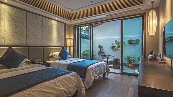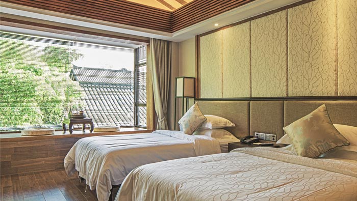 單人客房的設(shè)計(jì):此次位于庭院的中心區(qū)域,家的感覺也是設(shè)計(jì)師一貫的追求,設(shè)計(jì)師希望客戶在這里體會(huì)到家的感覺,陽臺(tái)供顧客品茶、交流之用,不要小看設(shè)計(jì)師對于陽臺(tái)的延伸,其實(shí)此次將整個(gè)空間的屬性進(jìn)行了一次升級(jí),讓客房擁有了茶文化,無形之中提高了顧客的品味。