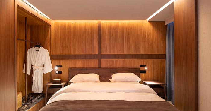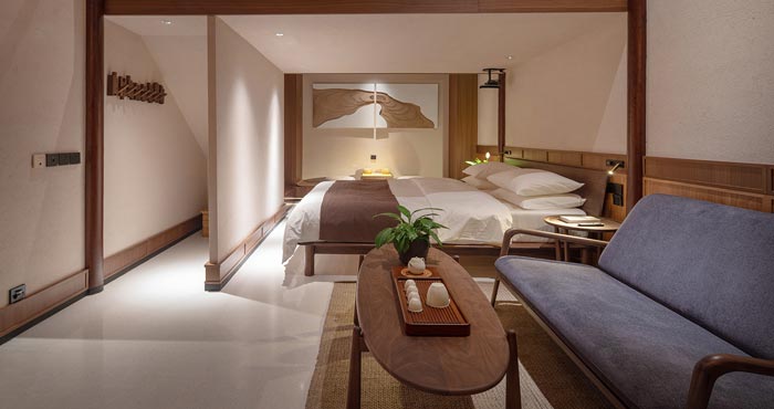 本次民宅民宿設計項目介紹結束,在設計中保留原建筑的柱網(wǎng)空間,同時以院落為中心,將空間劃分為四個客房區(qū)域,整體呈現(xiàn)中軸對稱的格局。