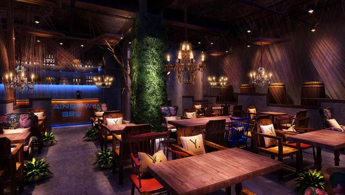燒烤店進(jìn)門區(qū)裝修設(shè)計:客戶進(jìn)門首先看到的就是BBQ,BBQ是西方的燒烤大會,與中國的燒烤類似,這里集合了中國的燒烤,與西方的燒烤,讓客戶在這里享受到不一樣的風(fēng)味。