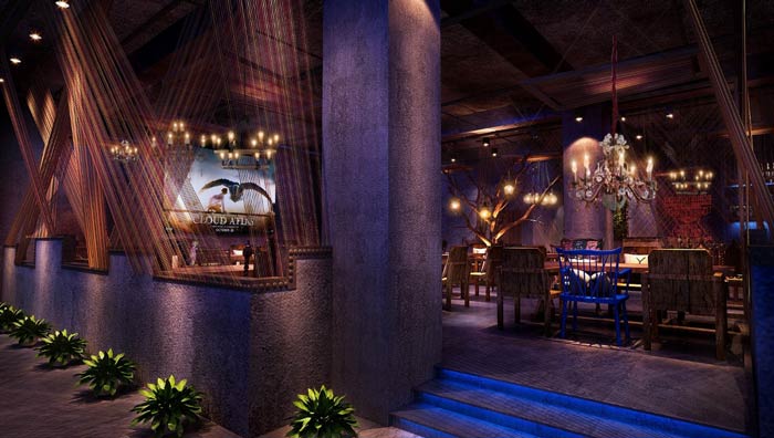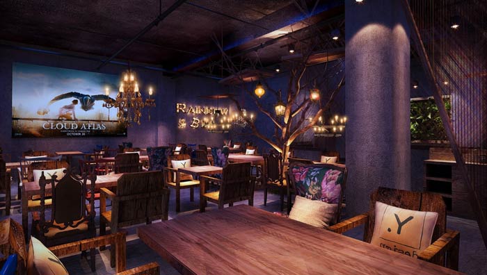 燒烤店屏幕裝修設(shè)計:之所以在這里安置屏幕,是業(yè)主希望讓客戶在這里享受到的不僅是美食、氛圍,同時也可以看到不錯的影視電影,在電影中感受美好,在美好中享受美食。