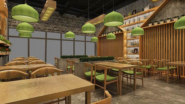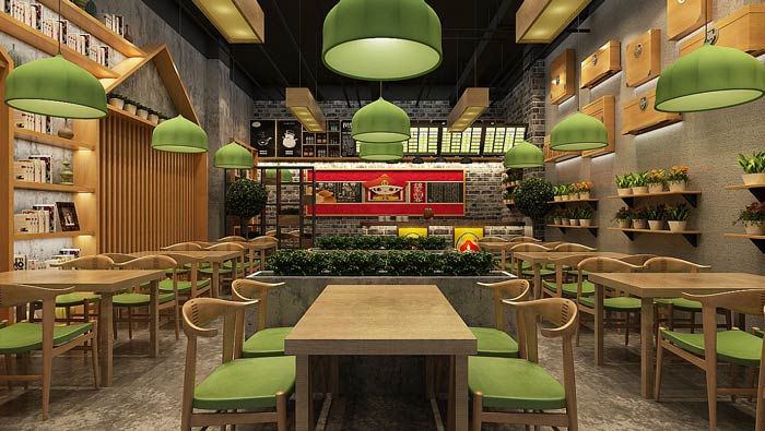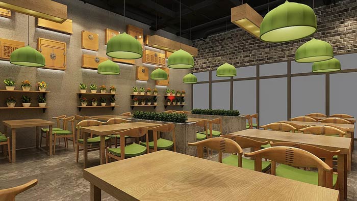 中式快餐店燈飾設(shè)計:綠色的燈罩、綠色的綠植、綠色的餐椅,一切的綠色設(shè)計是希望給客戶一種綠色的概念,這里的食物都是綠色無污染的,讓客戶在這里吃的放心、吃的安心。