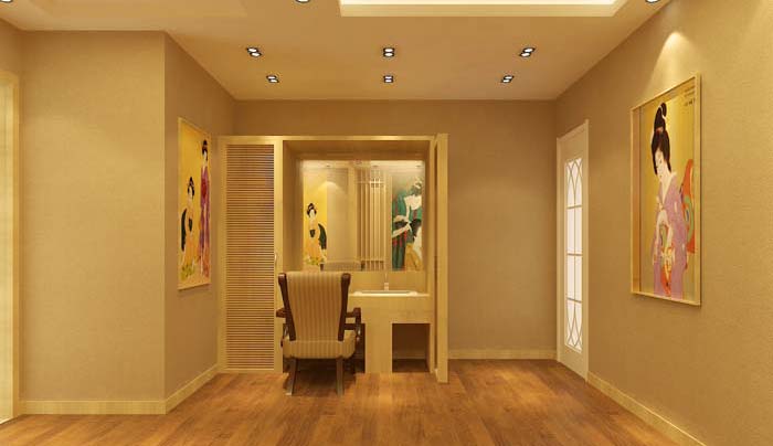 日式的SPA間,我們用了日式注明的細(xì)竹條做的花格,進(jìn)行紋樣的拼接,并且在花格上做了日式的浮世繪的刺繡。