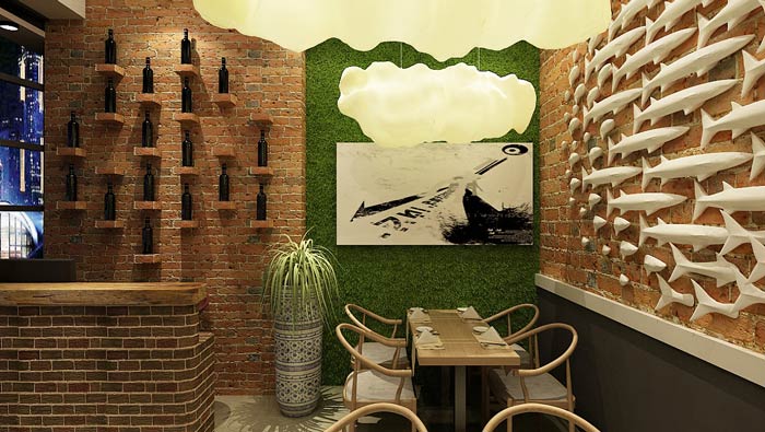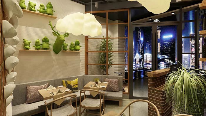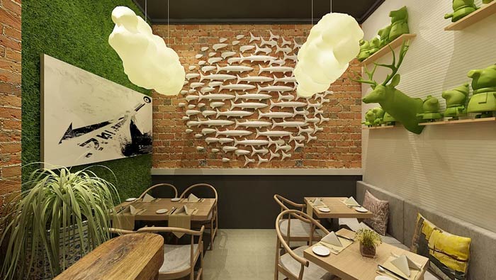 特色面館餐區(qū)裝修設(shè)計:這里有魚兒、鹿等動物,有綠植、綠色植物墻等植物,還有云狀的燈光,三者相連構(gòu)成一個動靜結(jié)合的空間,在這里整個空間宛若自成一體。