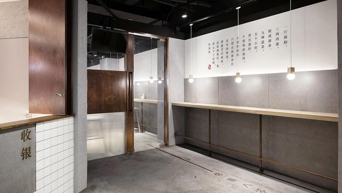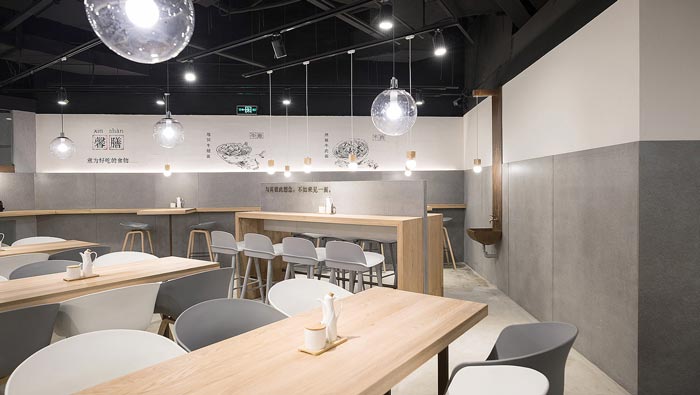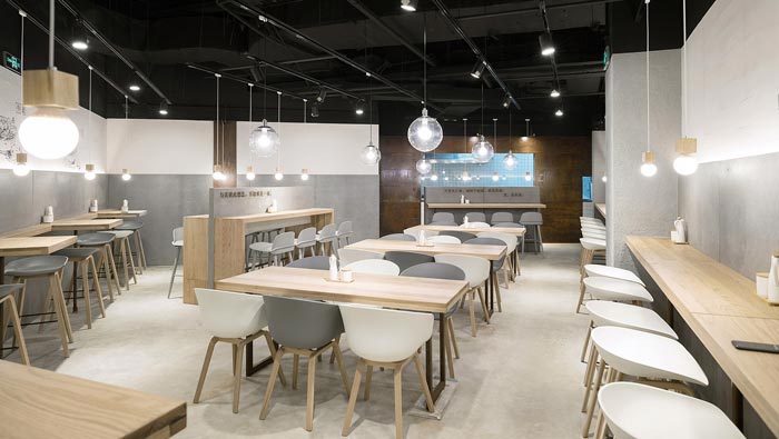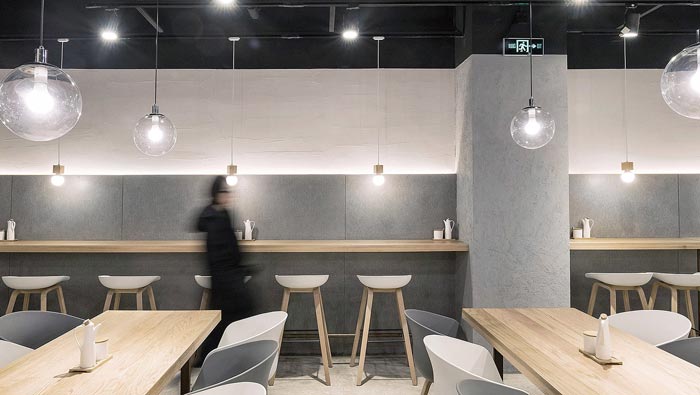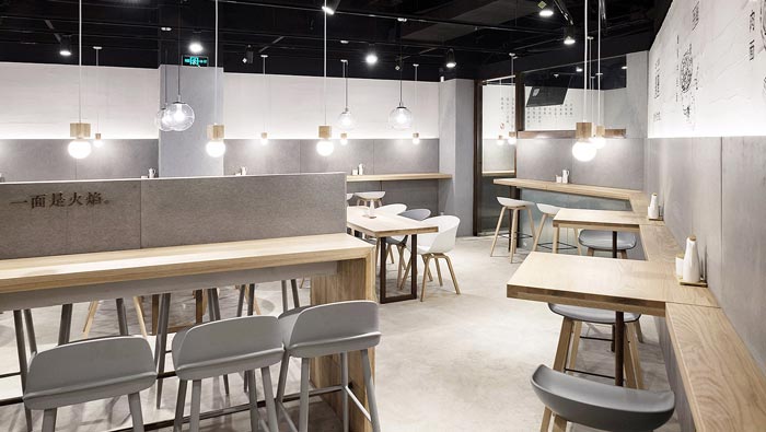 牛蛙面館餐位裝修設(shè)計:對著墻壁吃面不免局促孤單,而這正是店主與設(shè)計師想傳達的理念“專心吃好一碗面”,對著水泥墻面,吊著一盞溫暖小燈,將注意力集中在食物上。