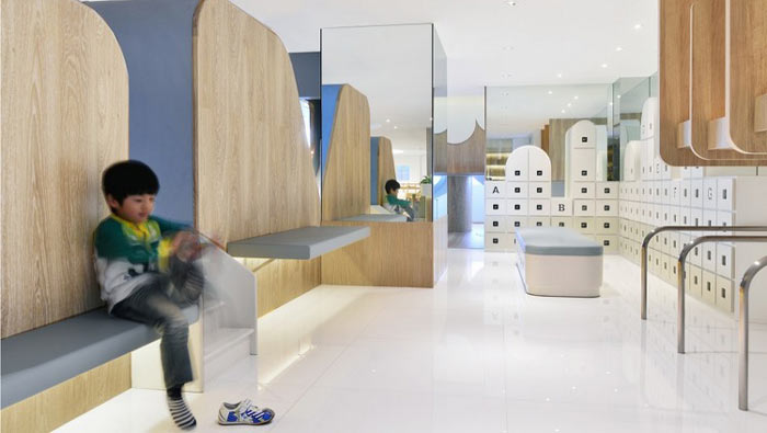 兒童教育培訓機構浴室設計:浴室內也有兩種高度的洗手臺,并設計成噴泉的形態(tài),令家長和兒童共享同一種設施,進而培養(yǎng)更加親密的關系。