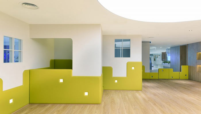 兒童教育培訓機構防磕碰設計:在孩子們可以夠得到的地方,設計師都加入了防磕碰海綿,目的就是希望給孩子一個安全、放松的空間,讓孩子們玩的開心、玩的放心。