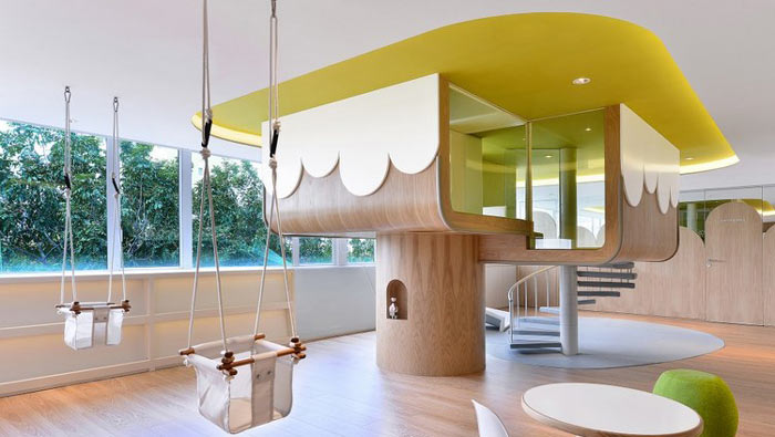 兒童教育培訓機構秋千區(qū)設計:探索樹上小木屋,讓孩子體驗像鳥一樣的自由自在,每天蕩秋千20分鐘,寶寶會快樂一整天,來源于戶外的靈感,營造舒適的室內玩??臻g。