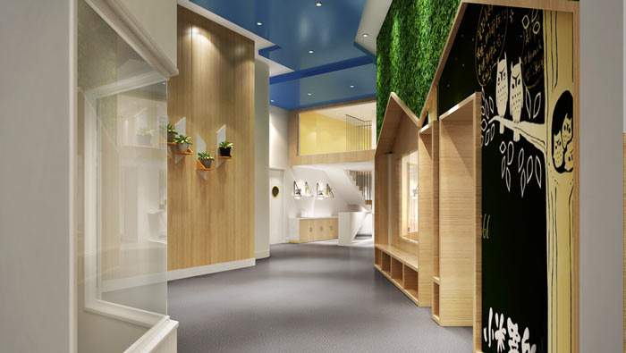 學(xué)前教育學(xué)校過道設(shè)計(jì):灰色的地面、實(shí)木的隔墻、綠色的綠植過程了一個(gè)自然的空間,在這里孩子們感受到的不是壓力,而是快樂,成長(zhǎng)的快樂。