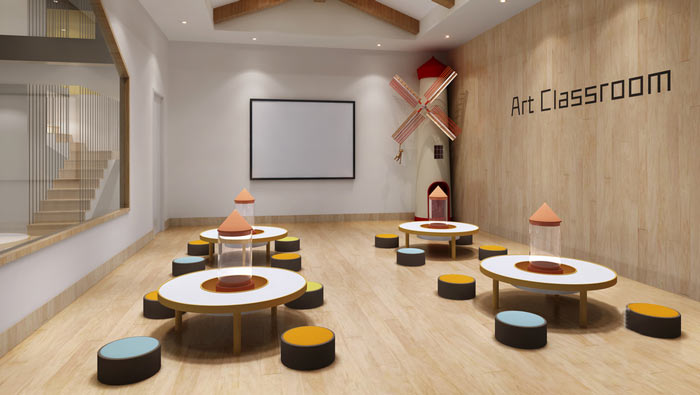 學(xué)前教育學(xué)校教室設(shè)計(jì):孩子們圍著圓形的桌子,在這里聽老師講自己細(xì)化的事物,在不斷接觸新事物的同時(shí),孩子們也在不斷的成長(zhǎng)、脫變。