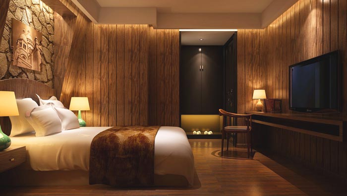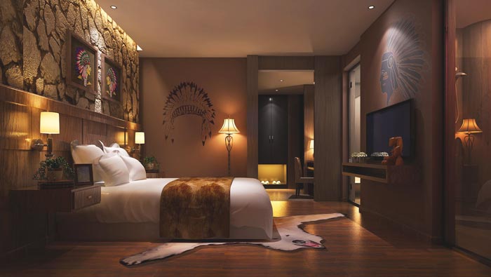 客房的設(shè)計(jì):此次描繪的是日出而作、日落而息的場(chǎng)景,在這里讓?xiě)偃梭w會(huì)的是生活的艱辛,但在生活的艱辛之后感受到的是彼此之間的依賴(lài),此處是希望戀人之間可以相互依存、相互幫助,不管遇到多大的困難,也要彼此共同面對(duì),此處雙方的是勇氣,是勇敢面對(duì)困苦的勇氣。
