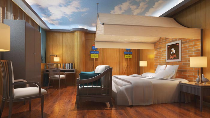 客房的設(shè)計(jì):此處給人的場(chǎng)景是未來(lái)的某一天,讓情侶對(duì)未來(lái)充滿(mǎn)期待,在設(shè)計(jì)師看來(lái)婚姻是世界上最美好的事情,但是在婚姻中也會(huì)遇到這樣那樣的事情,在這里戀人彼此之間可以想象一下未來(lái)的場(chǎng)景,在此處此時(shí)給對(duì)方一份承諾或期許。