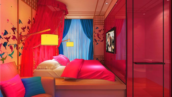 Hello Kitty客房的設(shè)計(jì):此處給大家?guī)?lái)的場(chǎng)景就是一個(gè)少女的心,設(shè)計(jì)師希望在這里,讓女孩子想起自己少女年代的美好畫面,讓男孩子可以走進(jìn)女孩子的心中,讓雙方彼此的感情更進(jìn)一步,在這里彼此的感情會(huì)經(jīng)過(guò)不斷的發(fā)酵,進(jìn)入一個(gè)新的階段。