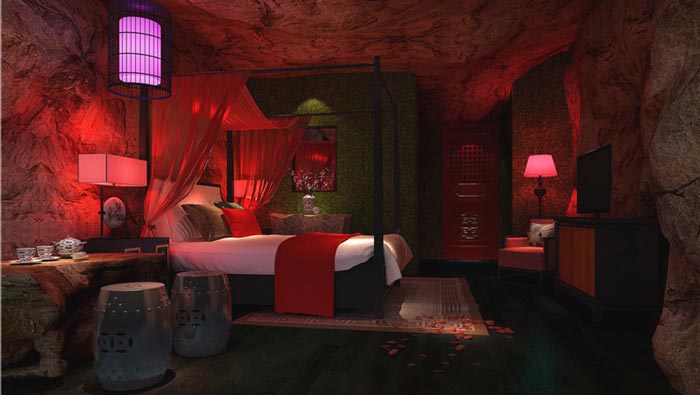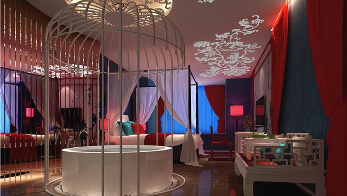 曠古奇緣客房的設(shè)計(jì):相信每一個(gè)人都有一個(gè)穿越的夢(mèng)想,都想穿越到過(guò)去用自己的本事,建造一份功業(yè)并遇到自己的紅顏知己,戀人們進(jìn)入空間之后,就仿佛與現(xiàn)世脫離,穿越到了五百年前,在這里設(shè)計(jì)師希望戀人們可以真切的體驗(yàn)一次古代的愛(ài)情,讓彼此之間的感情可以更上一層樓。