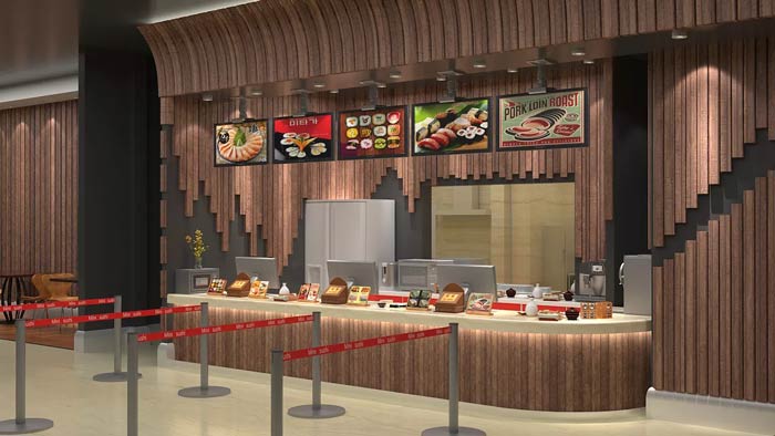 日式快餐廳收銀區(qū)設(shè)計:在這里設(shè)計師的設(shè)計重點就是分流,設(shè)計師要做的就是將人流導(dǎo)向更加的合理化,避免出現(xiàn)空間的擁擠,讓客戶從進門到用餐都體會到井然有序。
