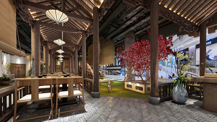 特色私房菜館亭臺設(shè)計:亭臺樓閣是設(shè)計師設(shè)計的方向,客戶在亭臺上面一邊吃著美食,一邊欣賞著院中的美景,這也是中式對自然與人的注解,在這里人與自然融為一體。