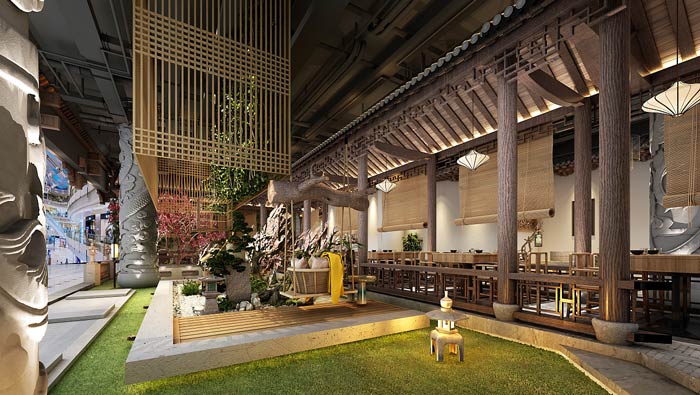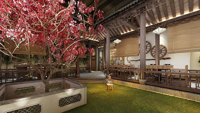 特色私房菜館庭院設(shè)計:庭院是空間給人的第一感覺,這也是設(shè)計師希望看到的,從整體看整個空間,無一不展現(xiàn)著中式的魅力,設(shè)計師希望打造一個區(qū)別于現(xiàn)在的設(shè)計。