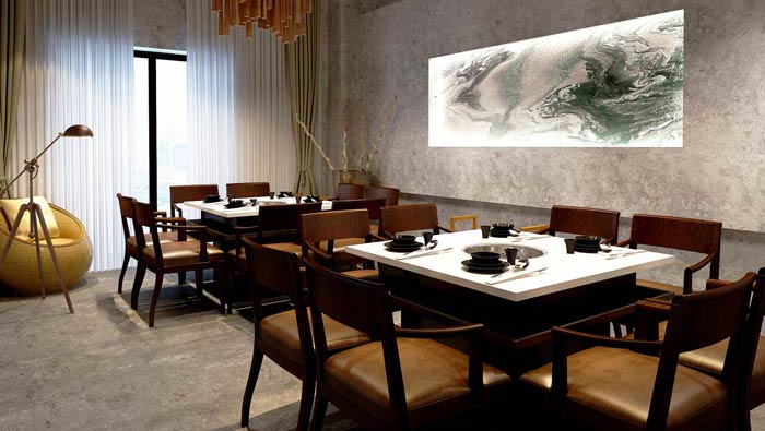 私家菜館進門區(qū)裝修設(shè)計:此處給客戶的第一感覺好似茶室,這也是設(shè)計師希望看到的,當(dāng)客戶在欣賞完美景之后,最想要的就是來一本茶水,以茶為開端正是服務(wù)的開端。