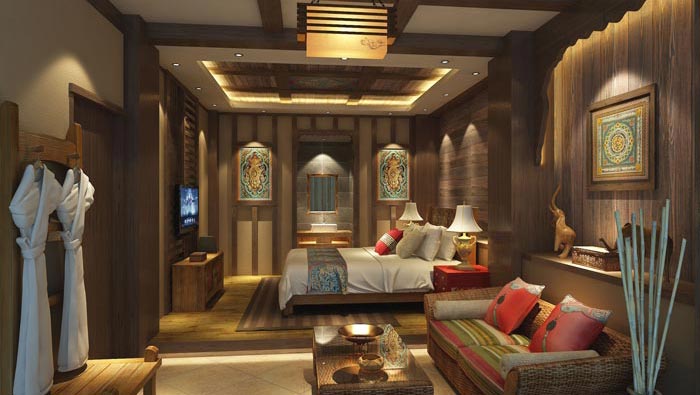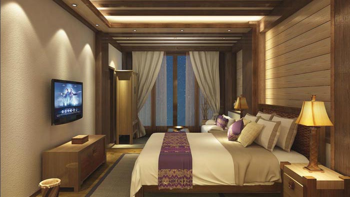 特色單人客房的設(shè)計(jì):在此處設(shè)計(jì)師融入了藏式的裝飾品,并在其中以藏式裝飾為主,因?yàn)椴刈迨艿阶诮毯兔袼椎挠绊?,?duì)墻面和構(gòu)件細(xì)部的色彩運(yùn)用和處理,有著各種不同的做法,但唯一不變的就是對(duì)人性的追求,在這里我們會(huì)感受到宗教的某種特色,在此間我們的心將得到一次凈化。