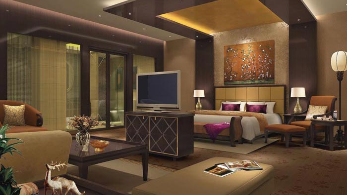 總統(tǒng)套房臥室的設(shè)計(jì):靜怡是此處給人的感覺,在這里給人的感覺不僅是安靜,而更多的是文化的熏陶,床邊的躺椅讓他們躺在那里看書,閱讀書籍是一種享受,在設(shè)計(jì)師看來(lái)書籍是連接古代先賢的重要媒介,在這里顧客的心可以完全安靜下來(lái),去體會(huì)心外無(wú)物的哲學(xué)問(wèn)題。