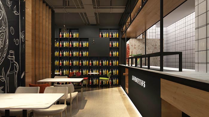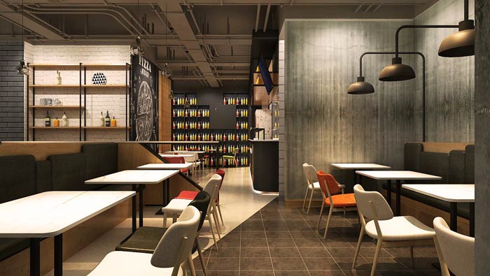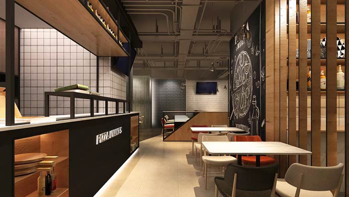 主題西餐廳進(jìn)門區(qū)裝修設(shè)計(jì):進(jìn)門左側(cè)是吧臺(tái),這是展示著各式各樣的披薩,將披薩放在空間的進(jìn)門區(qū)域,是希望讓客戶在進(jìn)門的第一瞬間,就被餐廳的美食所吸引。