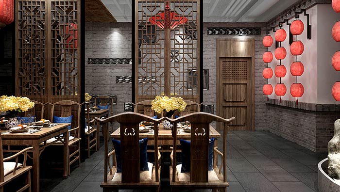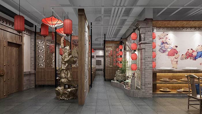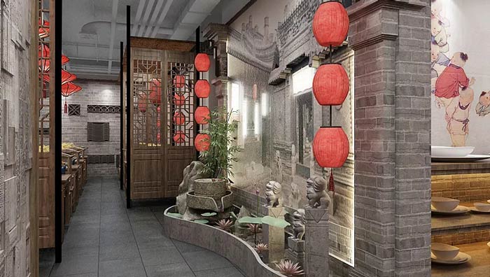 中餐廳中庭設(shè)計:客戶從這里進(jìn)入內(nèi)部空間,這里有石獅子、荷花、燈籠、大宅,各種不同的中式元素匯聚在這里,給人一種回家的感覺,在文化回歸的大環(huán)境下,這樣的氛圍更受人喜歡。
