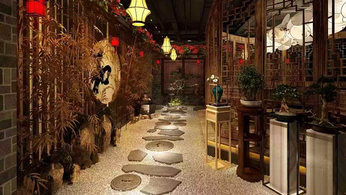 中餐廳過道設(shè)計(jì):過道是連接室內(nèi)與室外的重要通道,當(dāng)客戶經(jīng)過這里的時(shí)候,仿佛進(jìn)入了古代社會(huì),這里花草樹木與空間融為一體,讓客戶更加親近自然,讓客戶愛上這里。